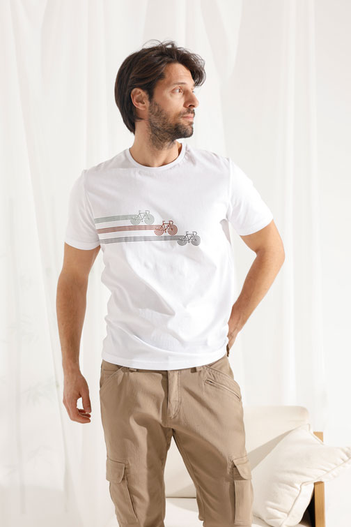 Bela pamučna majica sa printom predstavlja savršen spoj udobnosti i modernog dizajna. Izrađena od kvalitetnog pamuka, pruža prijatan osećaj na koži i omogućava prozračnost tokom celog dana, čineći je idealnim izborom za svakodnevno nošenje. Minimalistički grafički print na prednjem delu unosi dinamičan i savremen karakter, dok klasičan kroj sa kratkim rukavima obezbeđuje univerzalnu nosivost. Bela boja dodatno naglašava čistoću dizajna i omogućava lako kombinovanje uz farmerke, šortseve ili sportske pantalone. Praktičan i stilizovan model namenjen muškarcima koji biraju jednostavne komade sa diskretnim, ali upečatljivim detaljem.