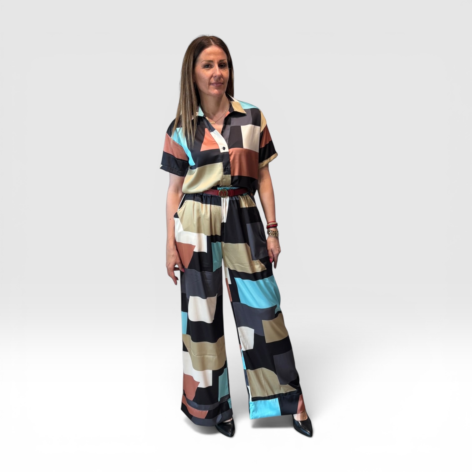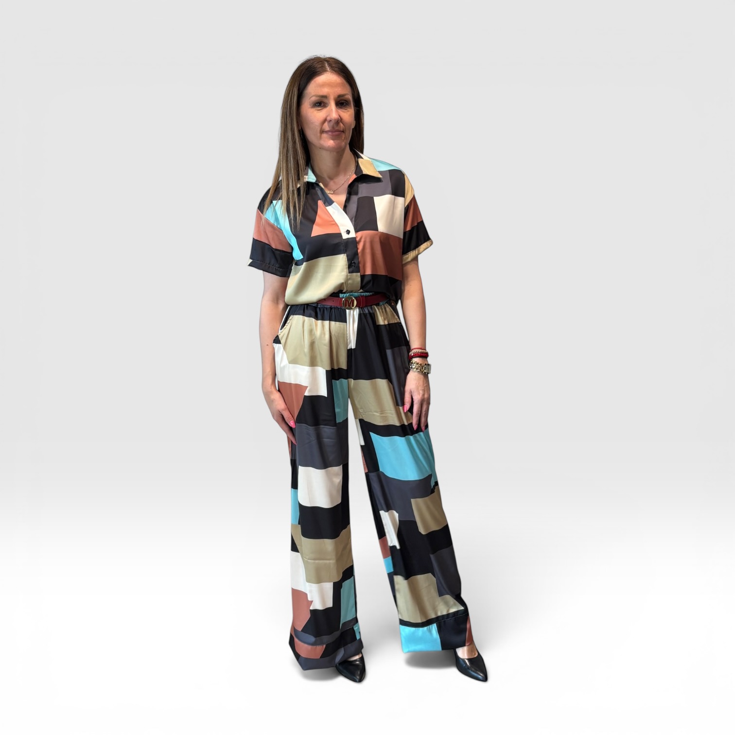 Moderna ženska bluza sa geometrijskim dezenom idealna je za žene koje vole upečatljive i elegantne modne kombinacije. Model ima kratke rukave i klasično kopčanje, dok kombinacija boja i zanimljivih oblika daje savremen i sofisticiran izgled. Bluza je izrađena od laganog i prijatnog materijala koji pruža udobnost tokom celog dana i lako se kombinuje uz pantalone, suknje ili elegantne setove.