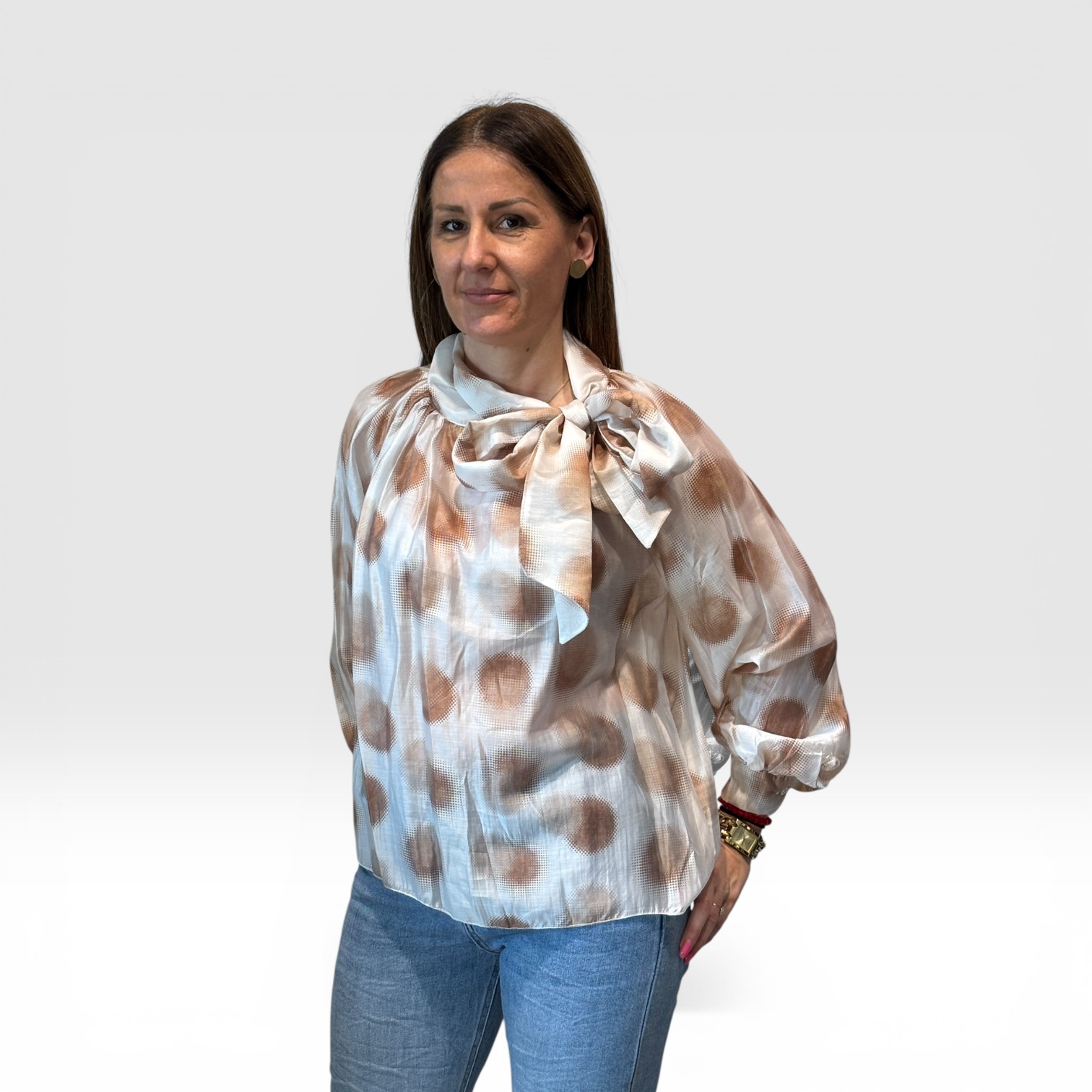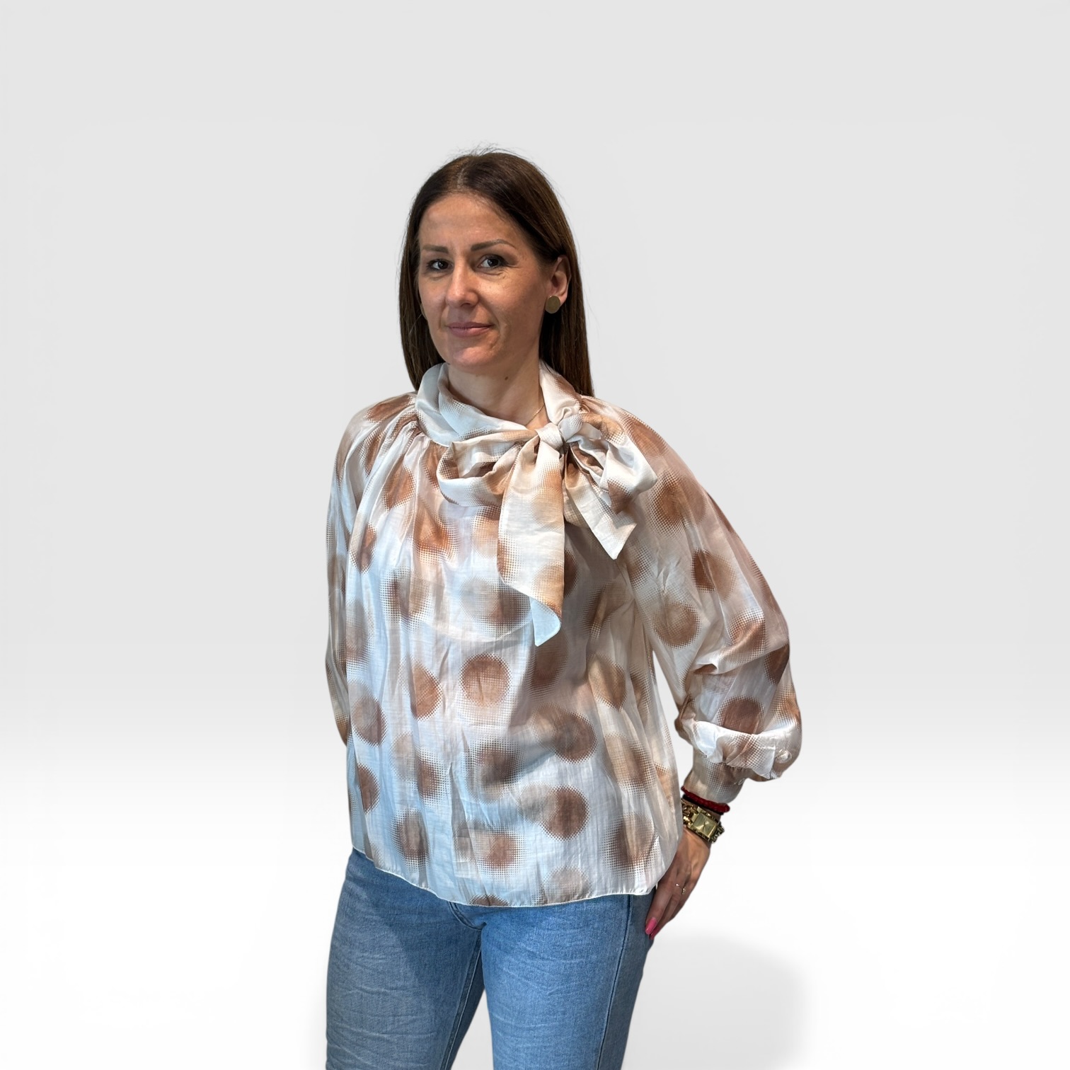 Elegantna ženska bluza sa mašnom predstavlja savršen izbor za sofisticiran i ženstven stil. Ovaj model sa dugim rukavima i dekorativnom mašnom oko vrata daje poseban modni akcenat i ističe eleganciju svake kombinacije. Lagani i prijatan materijal pruža udobnost tokom celog dana, dok diskretan dezen u toplim tonovima doprinosi modernom i prefinjenom izgledu.