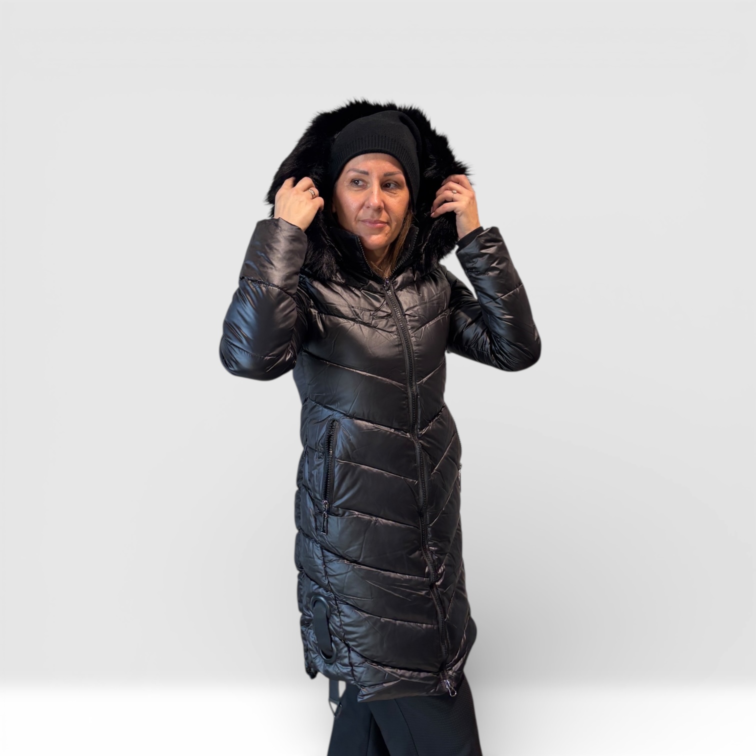 Duga ženska zimska jakna punjena toplim materijalom, sa prošivenim dizajnom koji prati liniju tela. Model ima kapuljaču sa bogatim veštačkim krznom za dodatnu zaštitu od hladnoće i vetra. Udobna, praktična i elegantna, savršen izbor za hladne zimske dane.