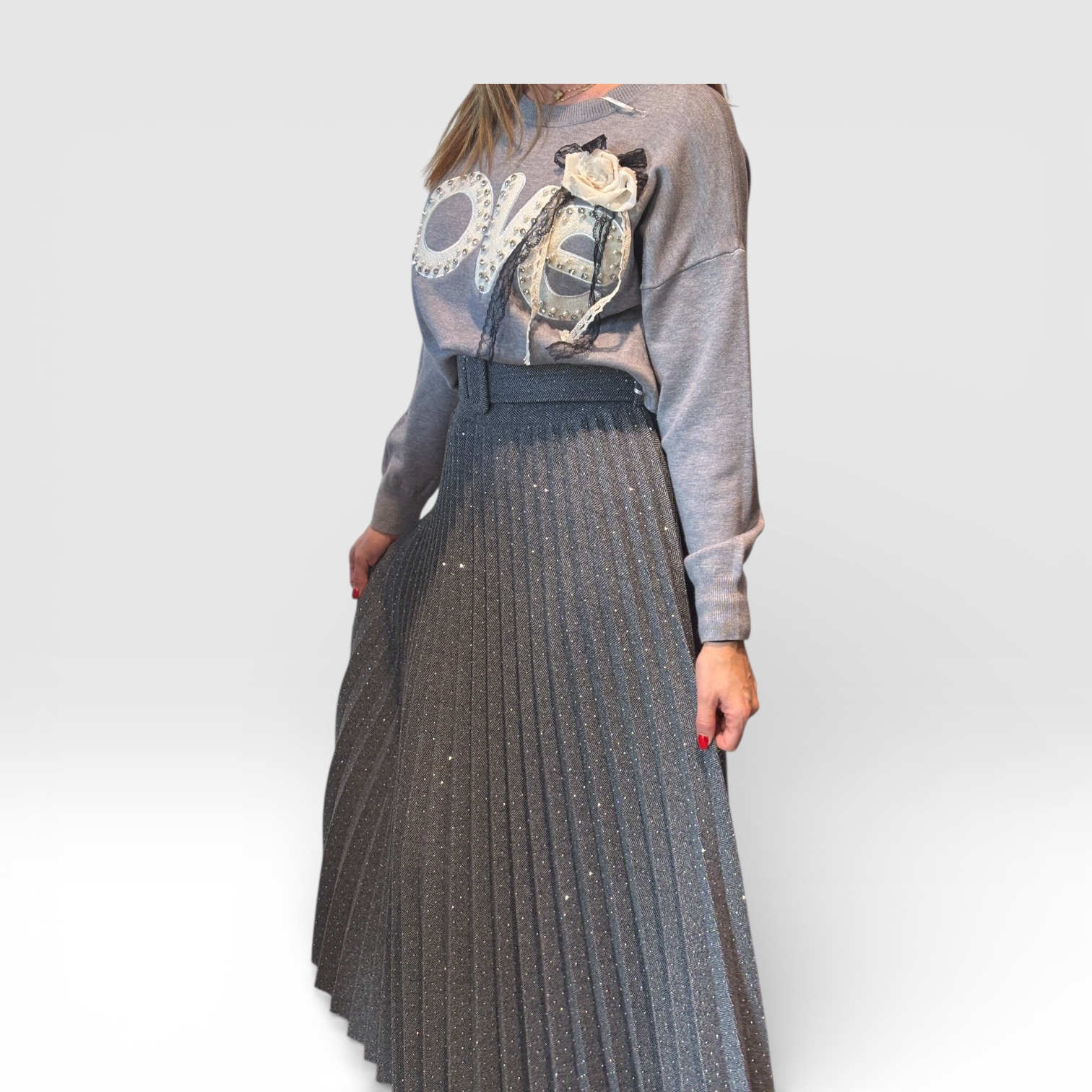 Elegantna plisirana suknja, sa visokim strukom koji ističe figuru. Izrađena od laganog i lepršavog materijala, ukrašena sitnim diskretnim tačkicama koje daju suptilan sjaj. Model sa pojasom dodatno naglašava struk i čini suknju idealnom za elegantne, ali i svakodnevne kombinacije.