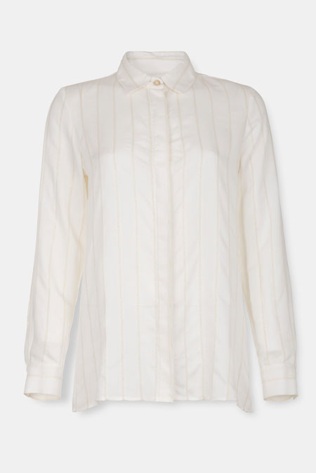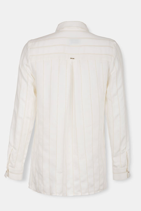 Bela košulja od viskoze sa zlatnim prugama odiše suptilnom elegancijom i sofisticiranim stilom. Izrađena od kvalitetne viskoze, pruža lagan i prijatan osećaj na koži, uz prirodnu prozračnost i mekoću materijala. Vertikalne zlatne pruge diskretno reflektuju svetlost i daju modelu profinjen, dekorativan karakter, dok istovremeno vizuelno izdužuju siluetu. Klasična kragna i kopčanje duž cele prednje strane zadržavaju bezvremenski izgled, čineći ovu košulju pogodnom za poslovne, svečane i elegantne dnevne kombinacije. Savršeno se kombinuje uz pantalone visokog struka, suknje ili sako, donoseći balans između klasične forme i modernog detalja. Model namenjen ženama koje biraju svedenu eleganciju sa suptilnim akcentom.