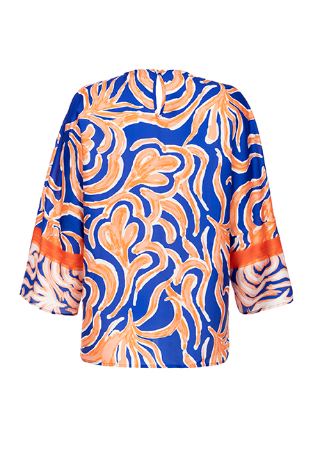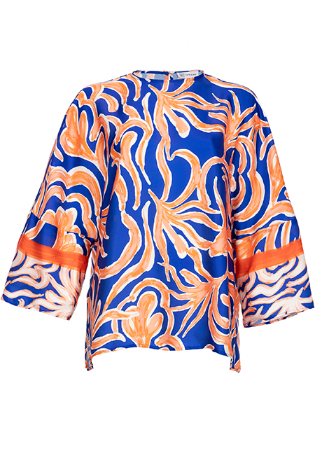 Oversize bluza cvetnog dezena sa okruglim izrezom. Kopčanje dugmetom pozadi.