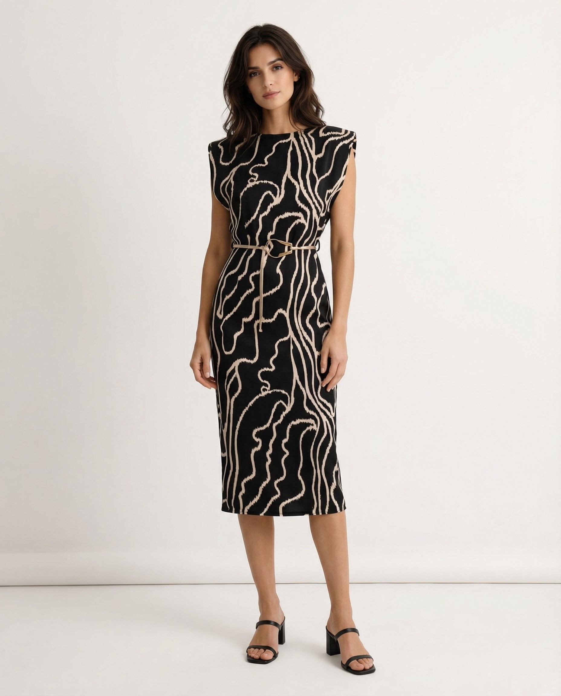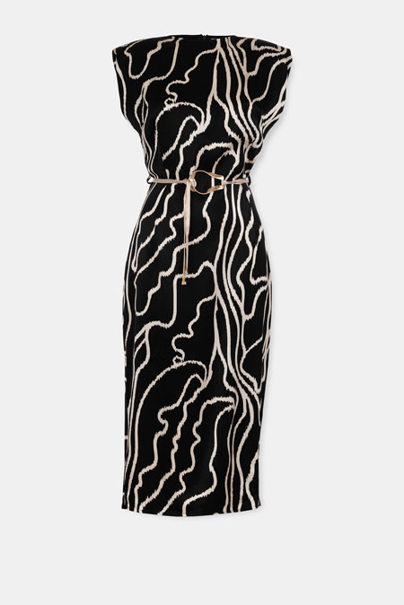 Viskozna haljina sa naglašenim ramenima izrađena je od 100% viskoze, materijala poznatog po svojoj mekoći, prozračnosti i prirodnom padu. Tkanina lagano prati liniju tela, stvarajući elegantnu i fluidnu siluetu. Naglašena ramena daju modelu strukturu i savremen karakter, dok pojas u struku dodatno definiše figuru i unosi ravnotežu između snage i ženstvenosti. Apstraktni dezen doprinosi vizuelnoj dinamici, čineći haljinu upečatljivom, ali i dovoljno sofisticiranom za različite prilike. Model je pogodan za poslovne događaje, večernje izlaske ili formalnije dnevne kombinacije – haljina koja spaja udobnost prirodnog materijala i snažan modni izraz.