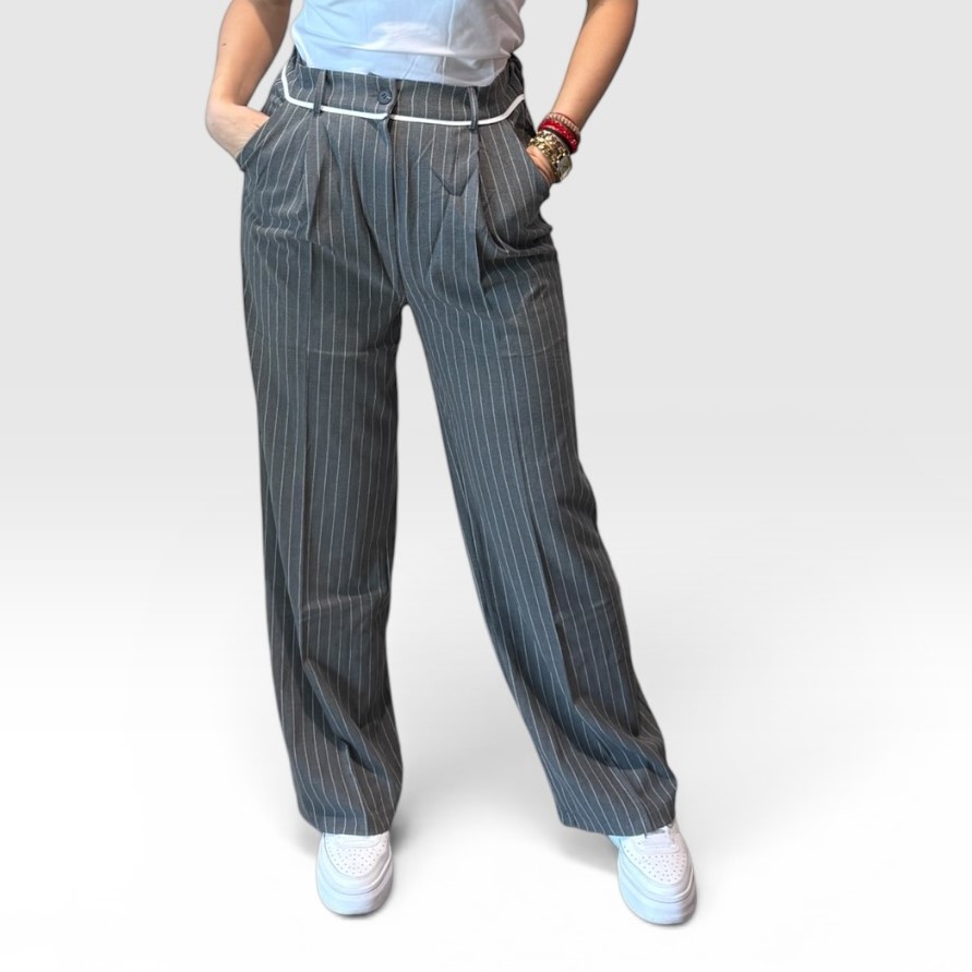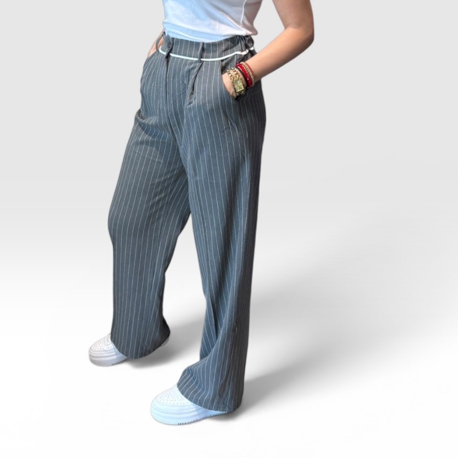 Elegantne ženske sive pantalone na pruge savršen su izbor za moderan i sofisticiran izgled. Model visokog struka sa vertikalnim prugama vizuelno izdužuje figuru i pruža elegantnu siluetu. Pantalone imaju praktične džepove i moderan kroj koji omogućava udobnost tokom celog dana.