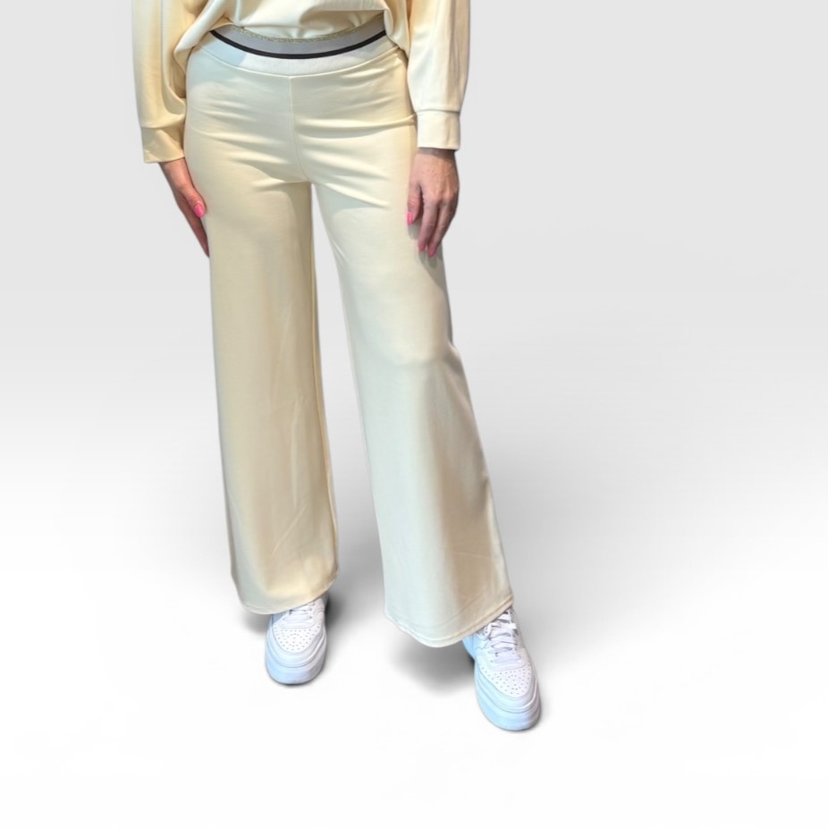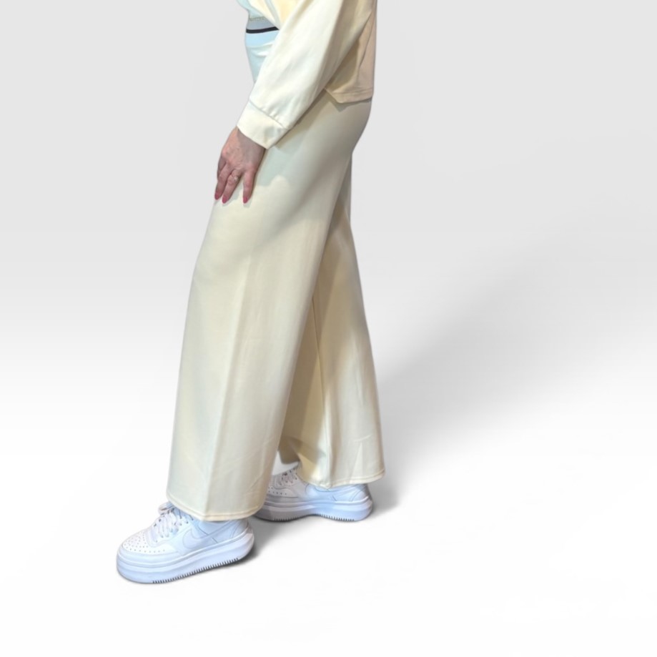 Elegantne i izuzetno udobne, ove pantalone u boji vanile dizajnirane su da prate tvoj ritam tokom celog dana. Visoki struk sa dekorativnim elastičnim pojasom ne samo da osigurava savršeno pristajanje, već i vizuelno naglašava figuru. Ravne i široke nogavice pružaju sofisticiranu siluetu, dok lagan i prijatan materijal omogućava slobodu pokreta.