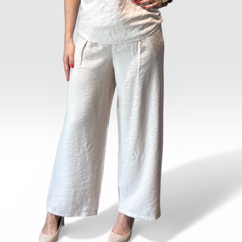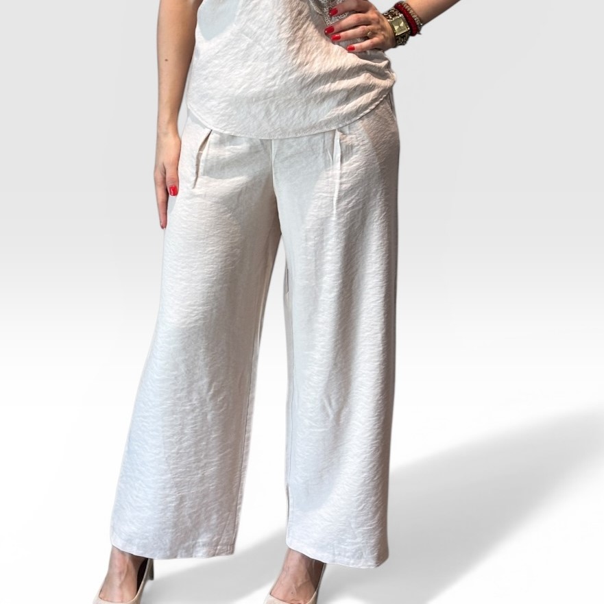 Široke ženske pantalone visokog struka izrađene od laganog i prozračnog materijala pružaju maksimalnu udobnost i slobodu pokreta. Minimalistički dizajn čini ih lako uklopivim uz različite komade garderobe, dok elegantan kroj doprinosi modernom i opuštenom izgledu. Savršen izbor za svakodnevne i letnje outfite.