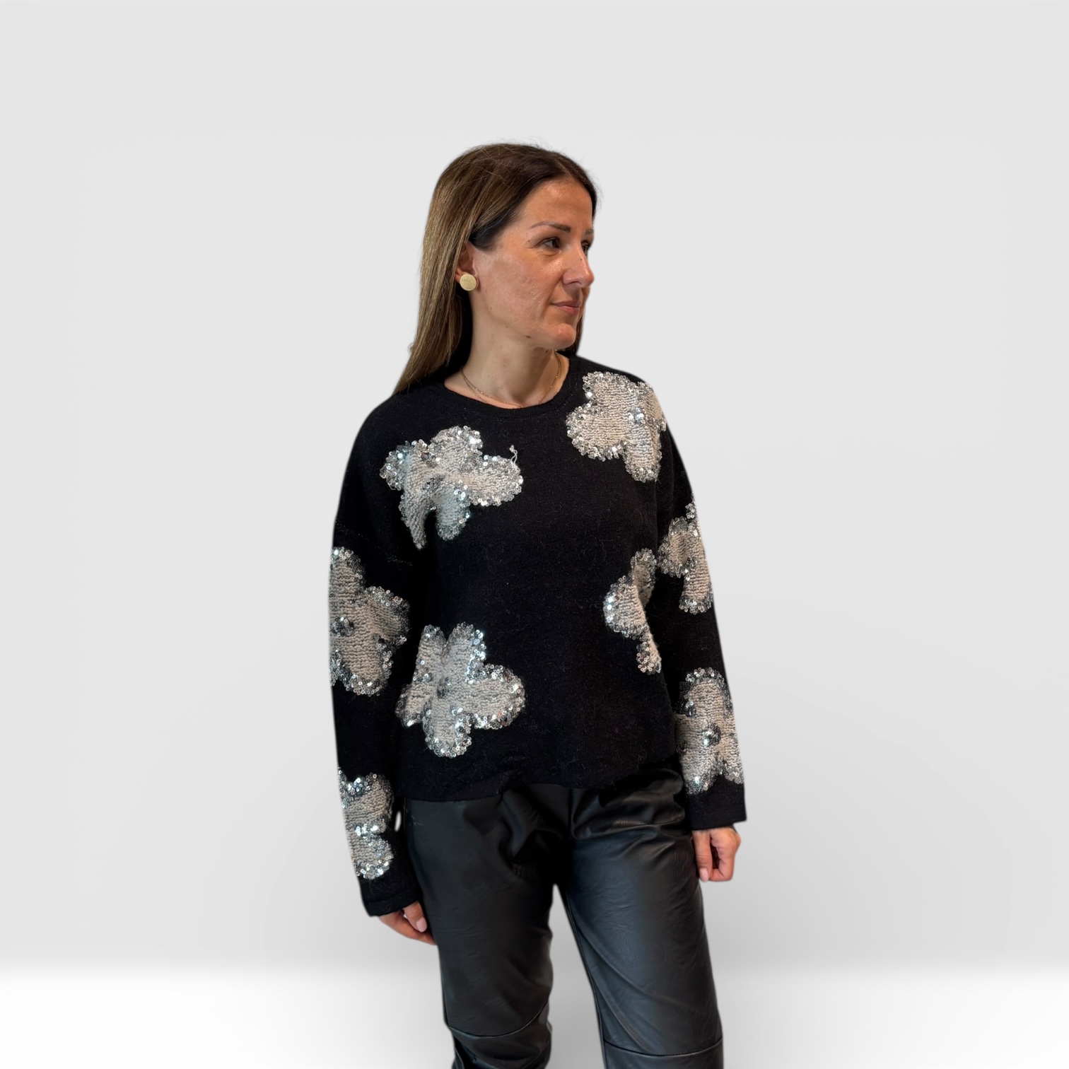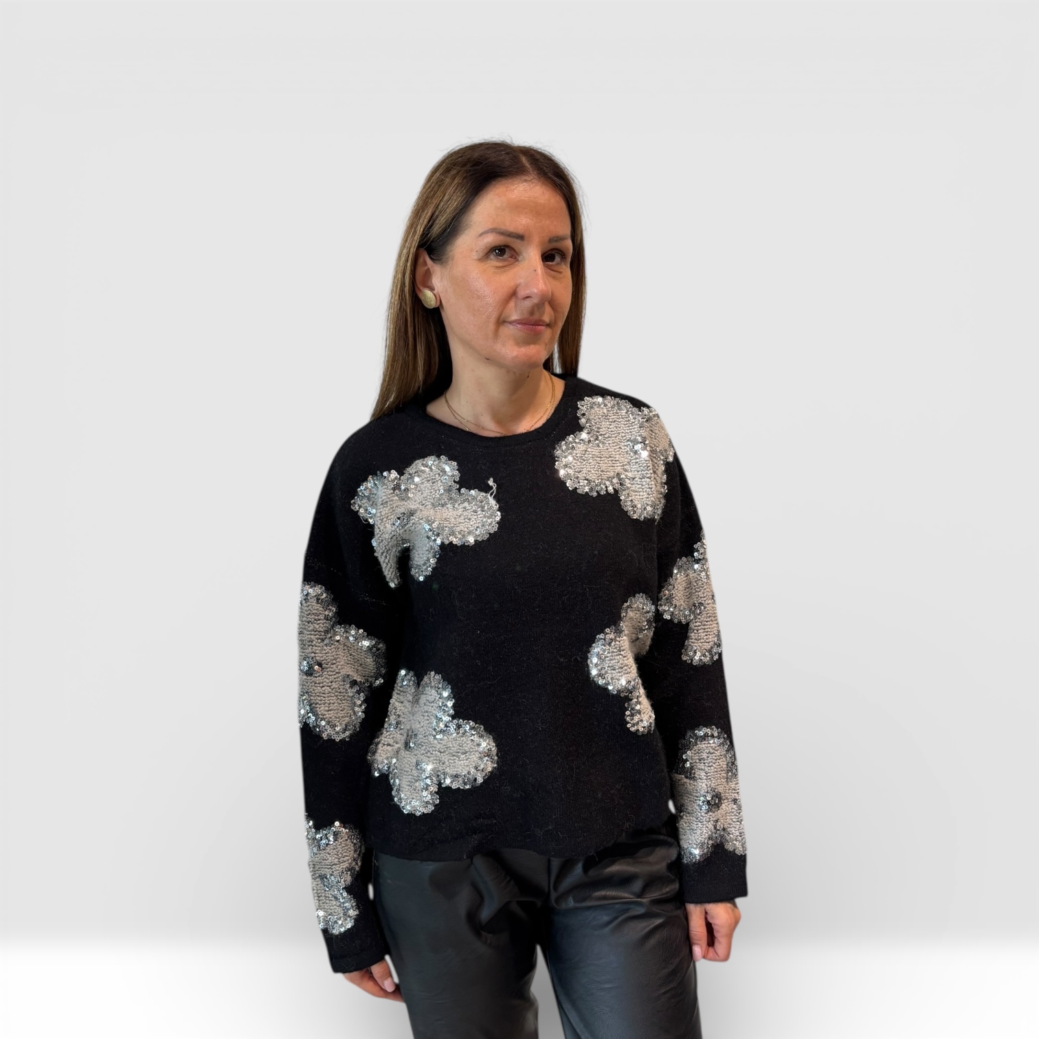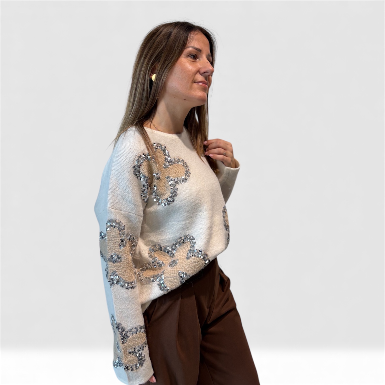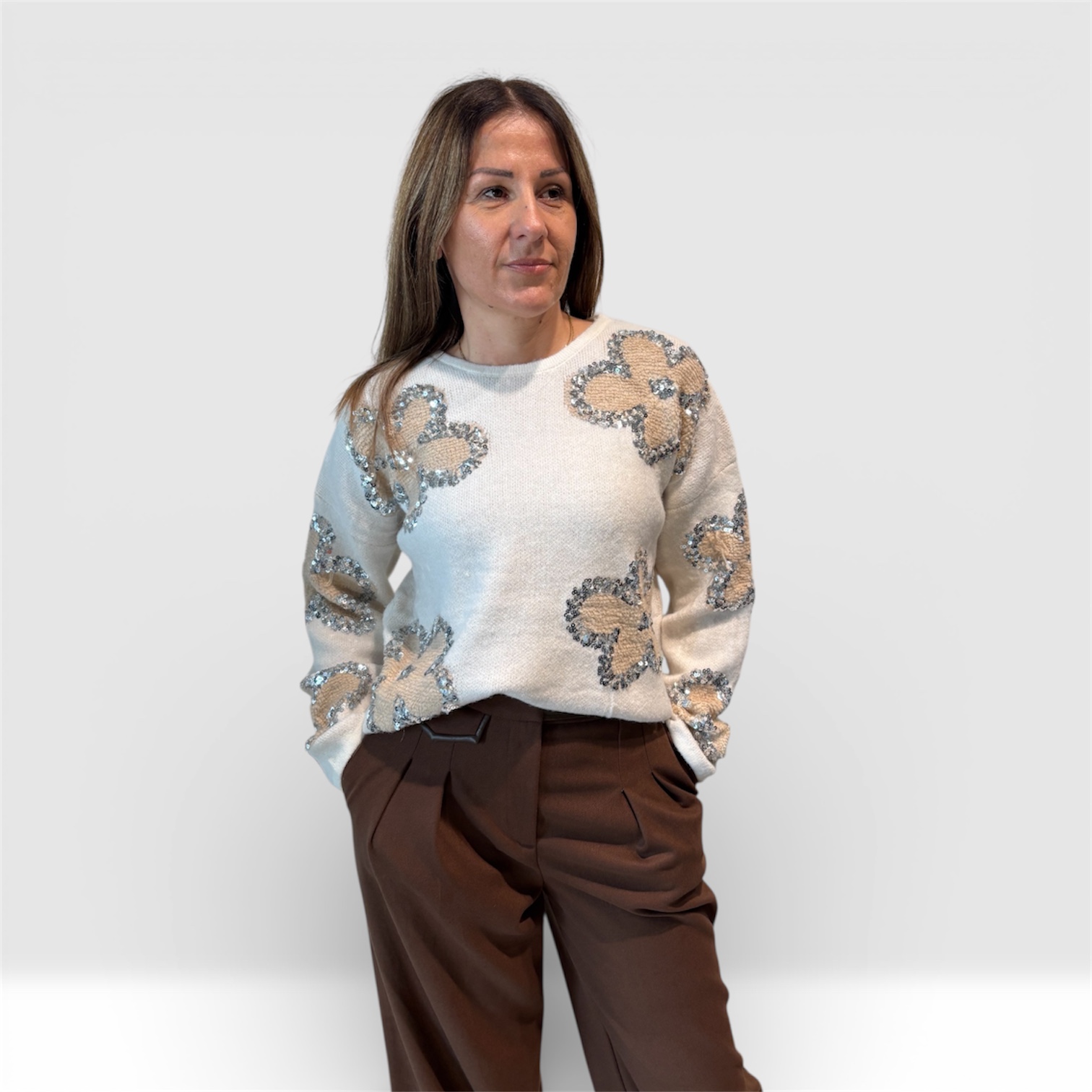 Elegantni ženski džemper od mekanog, prijatnog materijala, ukrašen diskretnim cvetnim motivima sa šljokicama. Klasičan kroj sa okruglim izrezom pruža udobnost, dok dekorativni detalji daju posebnu dozu sjaja i sofisticiranosti. Idealan za elegantne dnevne i večernje kombinacije.