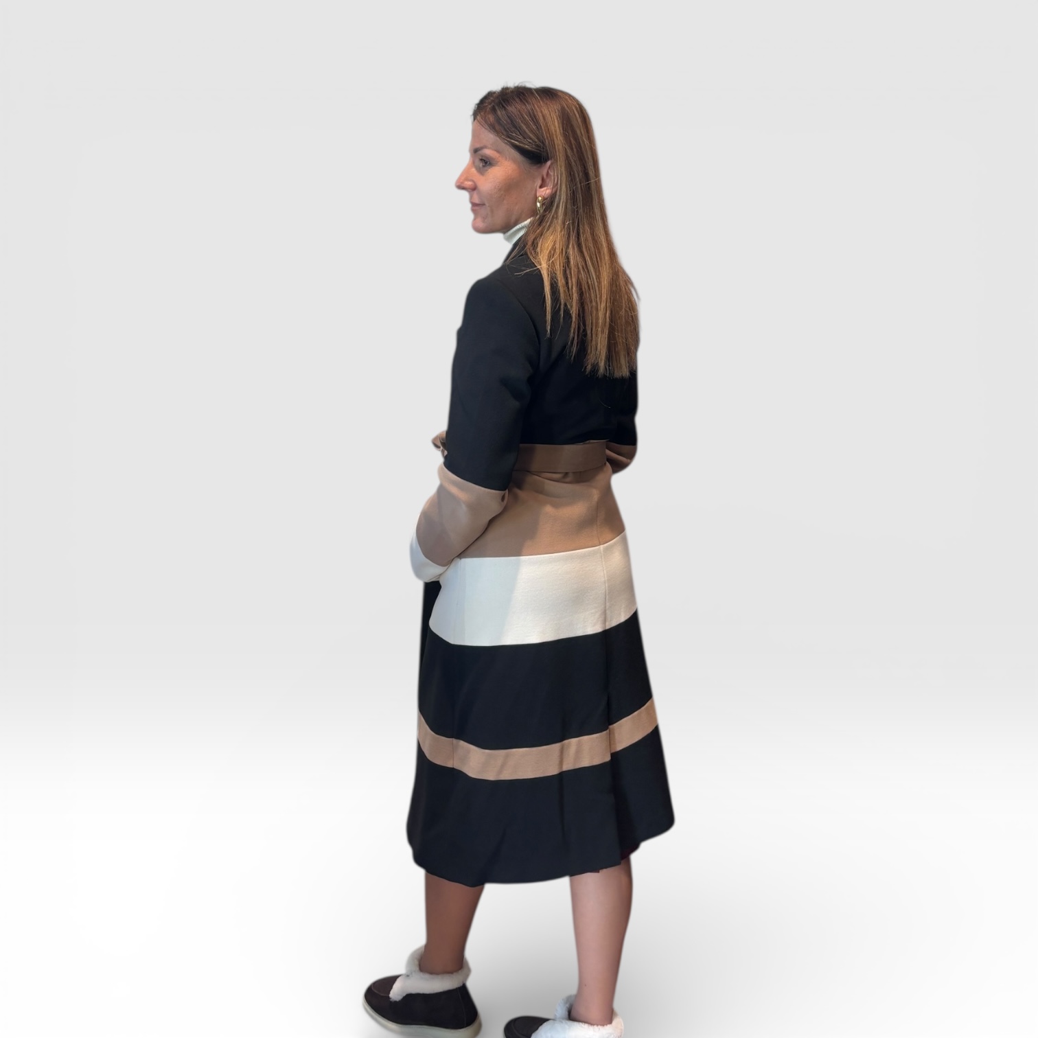 Elegantan kaput klasičnog kroja sa modernim color-block dizajnom. Strukiran model sa pojasom koji naglašava siluetu, izrađen od prijatnog i toplog materijala. Kombinacija crne, bež i krem boje daje sofisticiran izgled, idealan za svakodnevne i poslovne kombinacije.