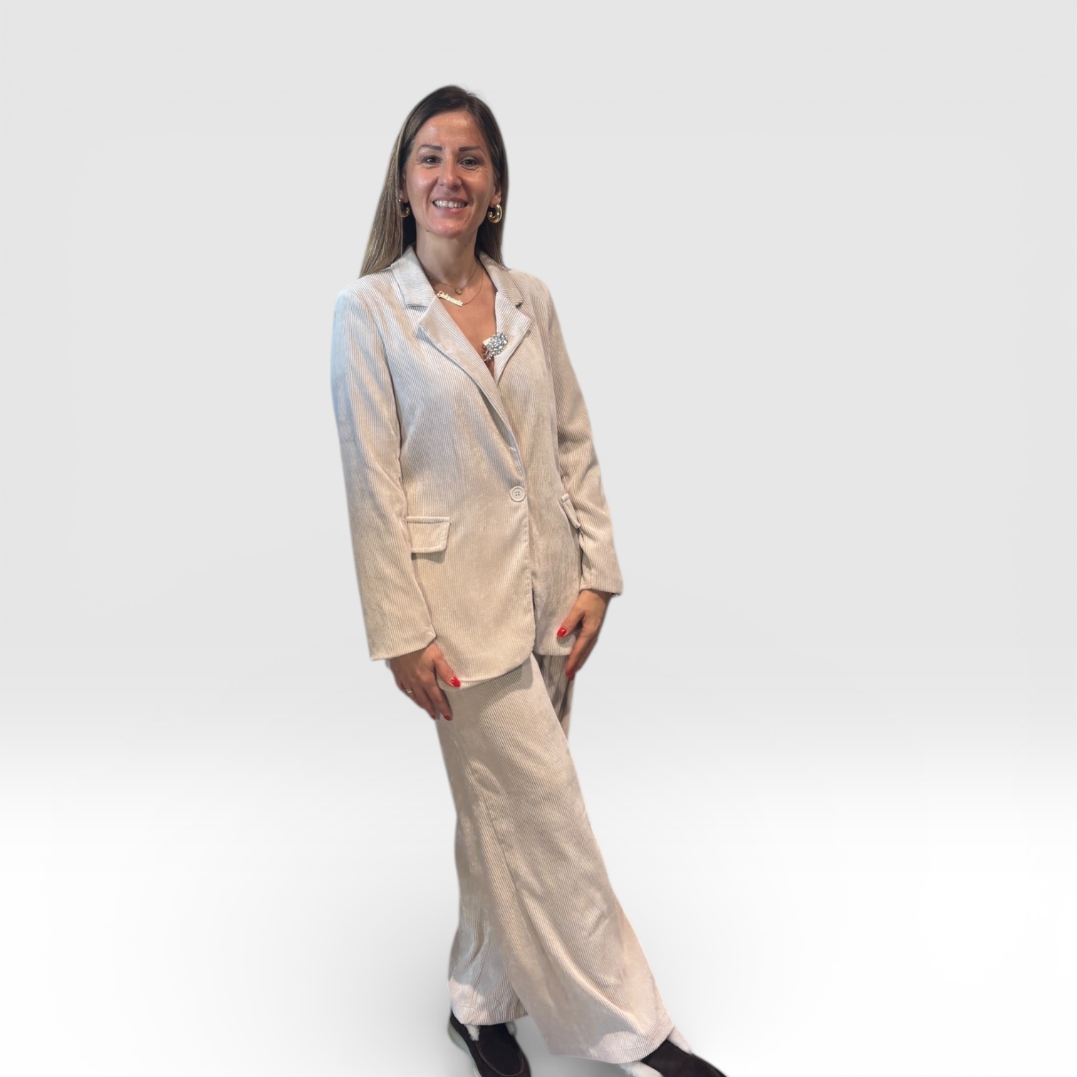 Elegantni dvodelni komplet koji se sastoji od sakoa i pantalona ravnog kroja. Izrađen od prijatnog, lagano teksturiranog materijala koji lepo pada i pruža udobnost tokom nošenja. Sako klasičnog dizajna sa reverima i dugmetom daje sofisticiran izgled, dok pantalone produžuju siluetu i dodaju notu elegancije. Idealan izbor za poslovne prilike, svečanije događaje ili moderno dnevno izdanje.