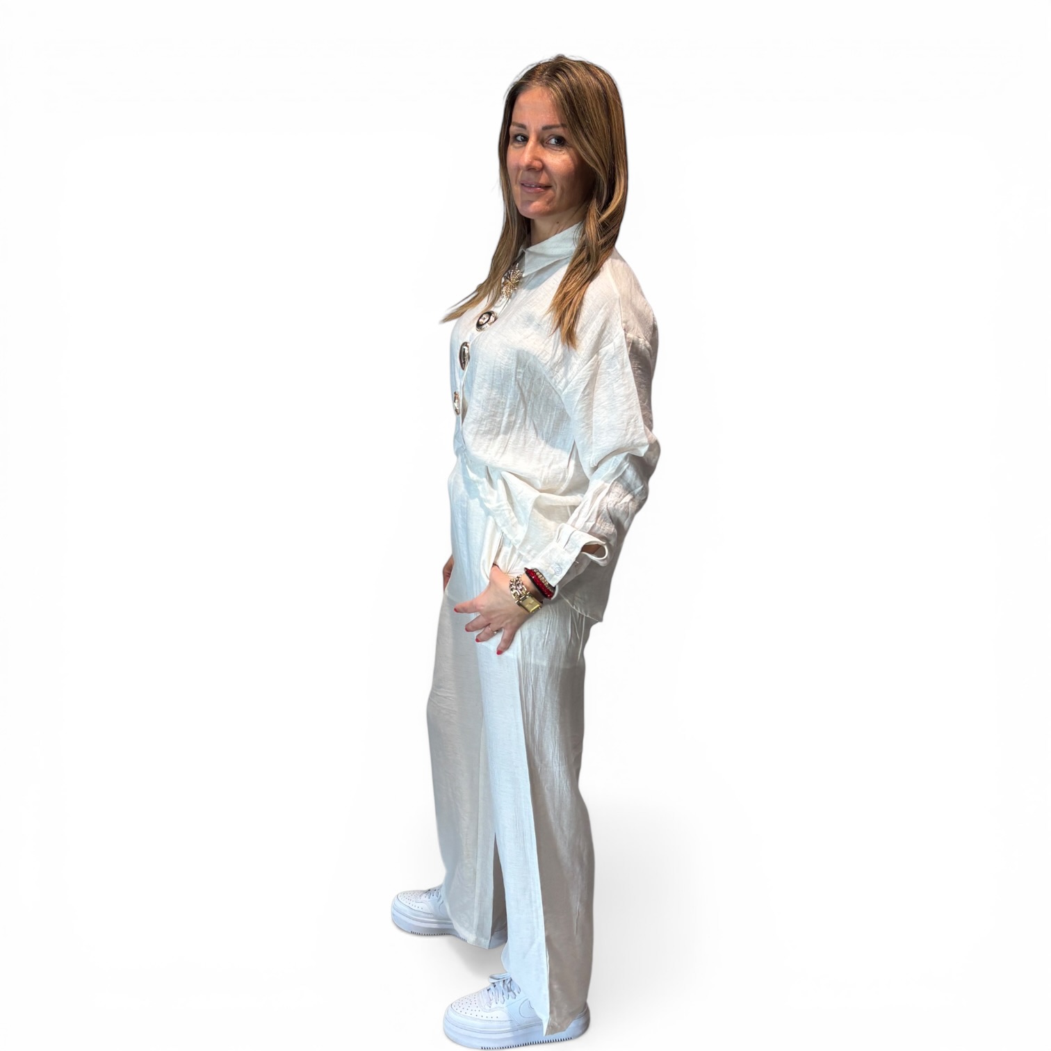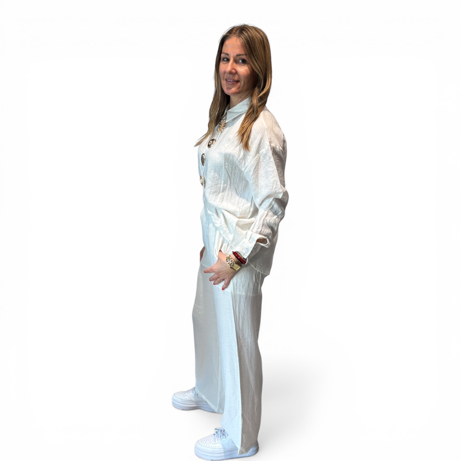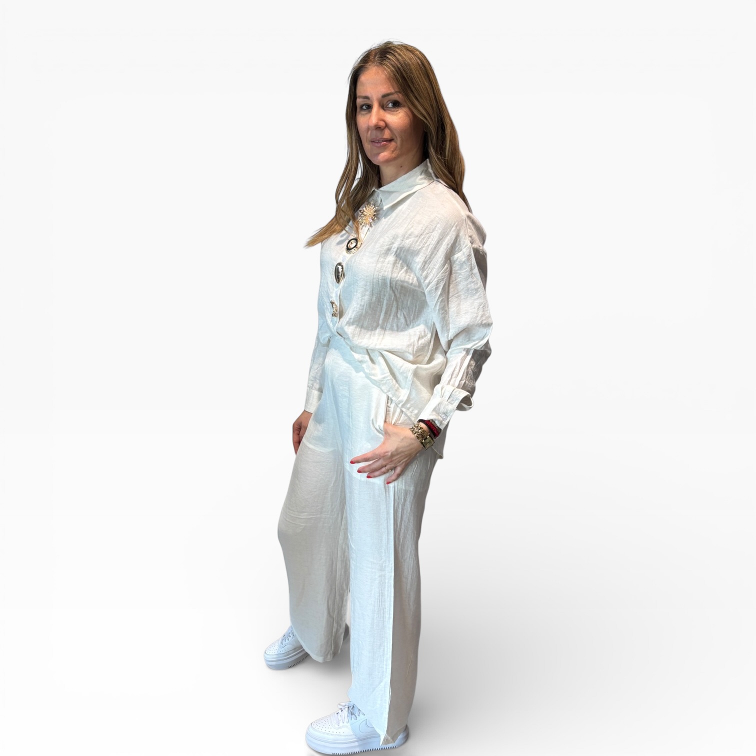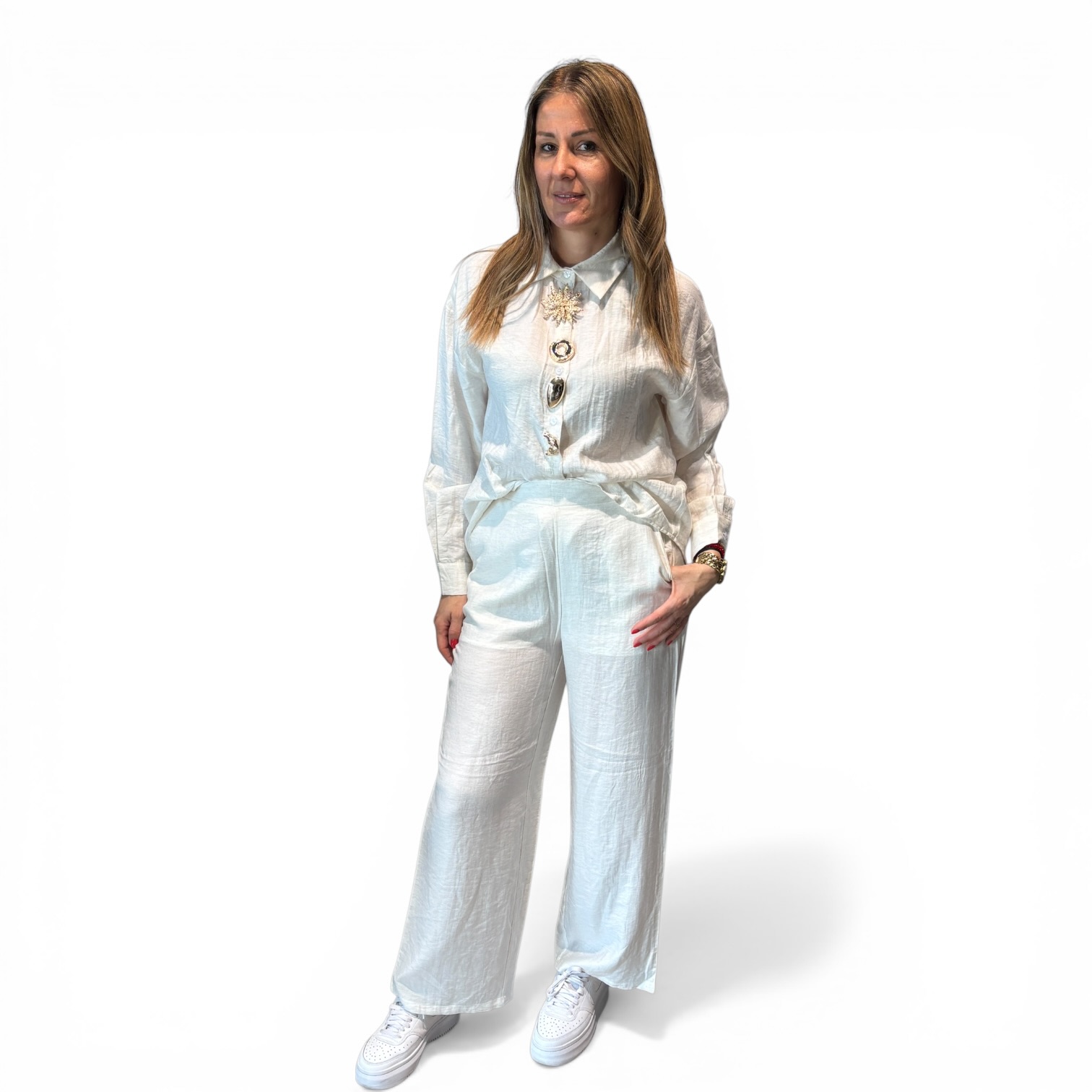Ovaj ženski komplet u beloj boji donosi savršen spoj elegancije i udobnosti. Košulja klasičnog kroja sa dekorativnim detaljima u predelu dugmadi daje sofisticiran izgled, dok široke pantalone pružaju slobodu pokreta i dodatno naglašavaju lepršav i moderan stil. Lagan i prijatan materijal čini ga idealnim za celodnevno nošenje.