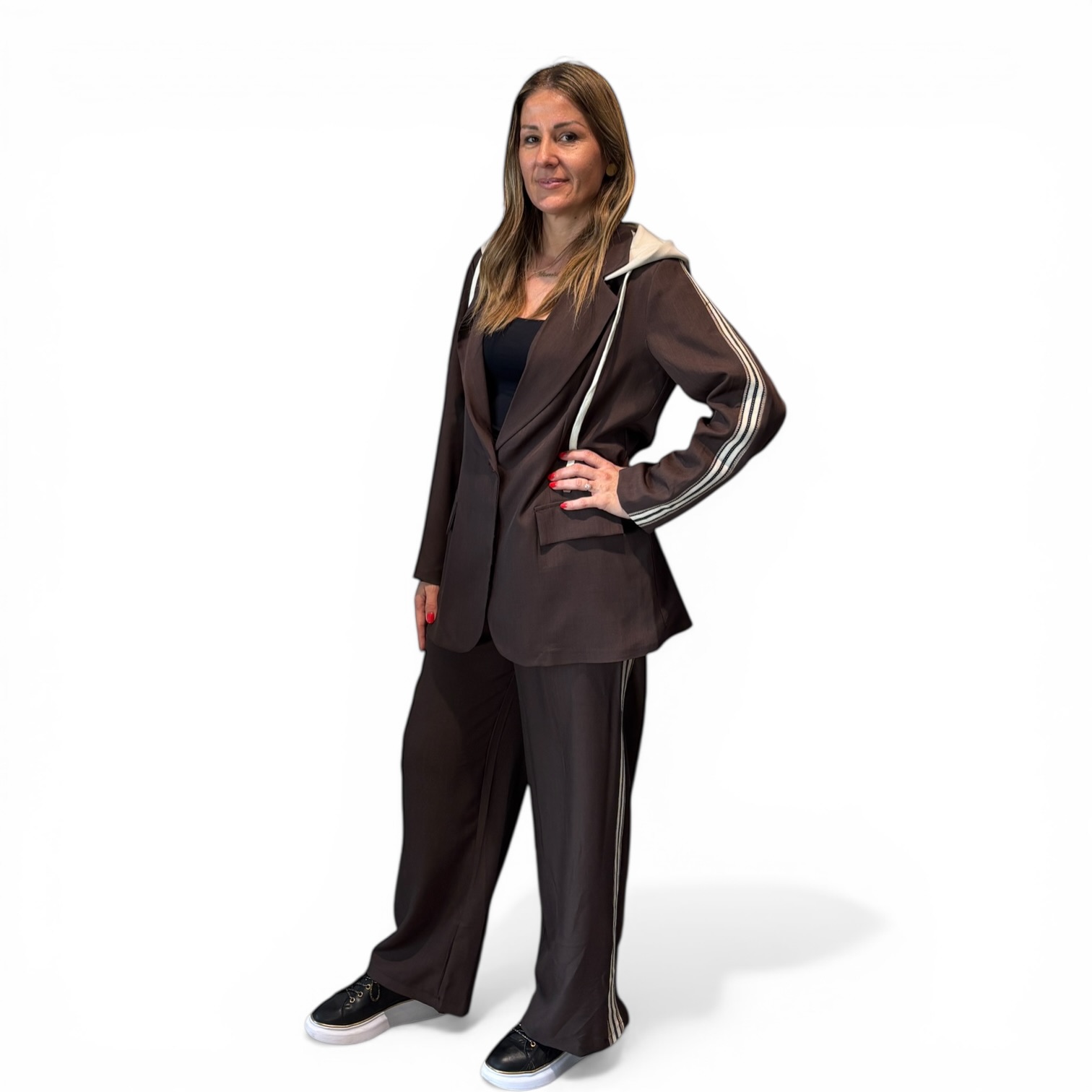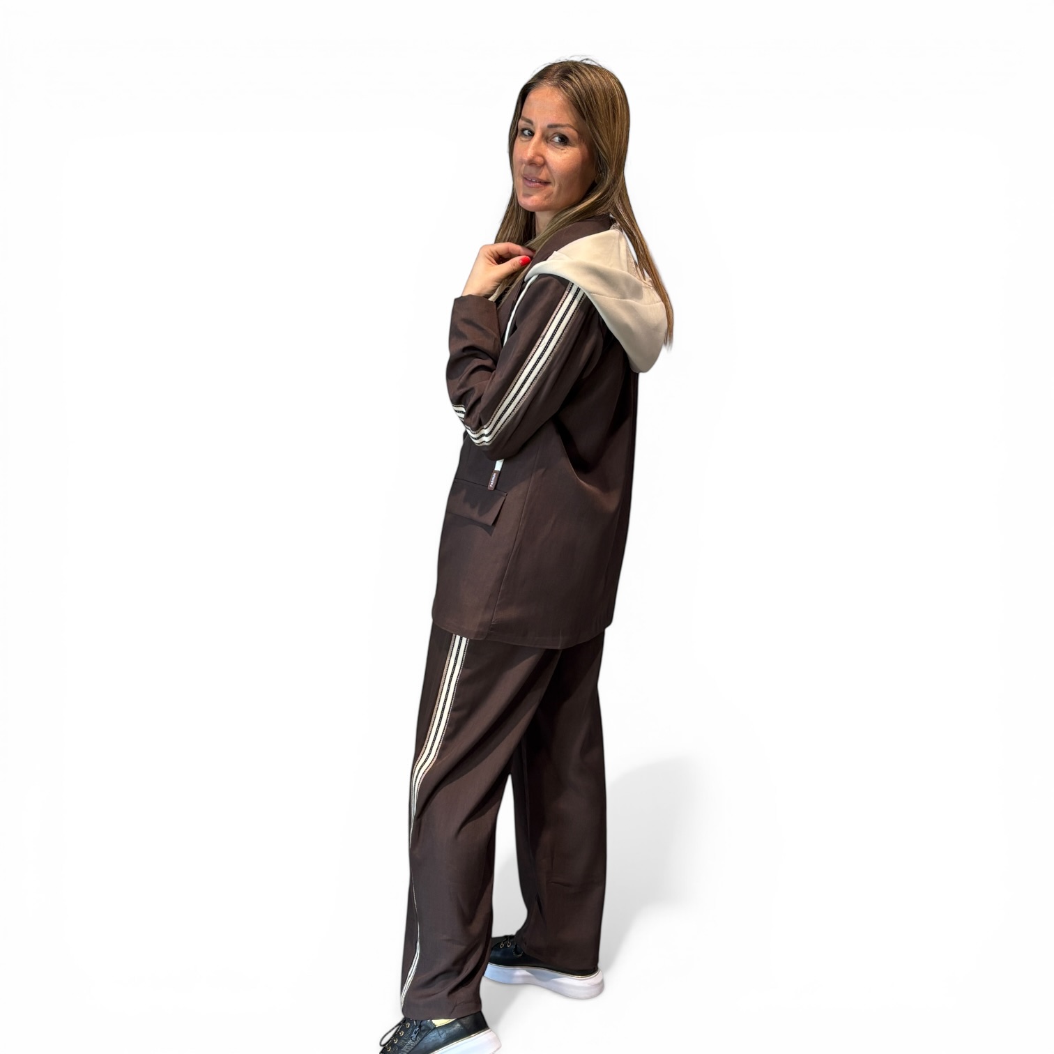Ovaj moderan ženski komplet u tamno braon nijansi savršeno spaja eleganciju i sportski stil. Sako sa kapuljačom i prugama na rukavima daje unikatan i trendi izgled, dok široke pantalone sa istim detaljima pružaju udobnost i slobodu pokreta. Kroj je prilagođen da lepo prati liniju tela, a istovremeno ostavlja opušten i sofisticiran utisak.