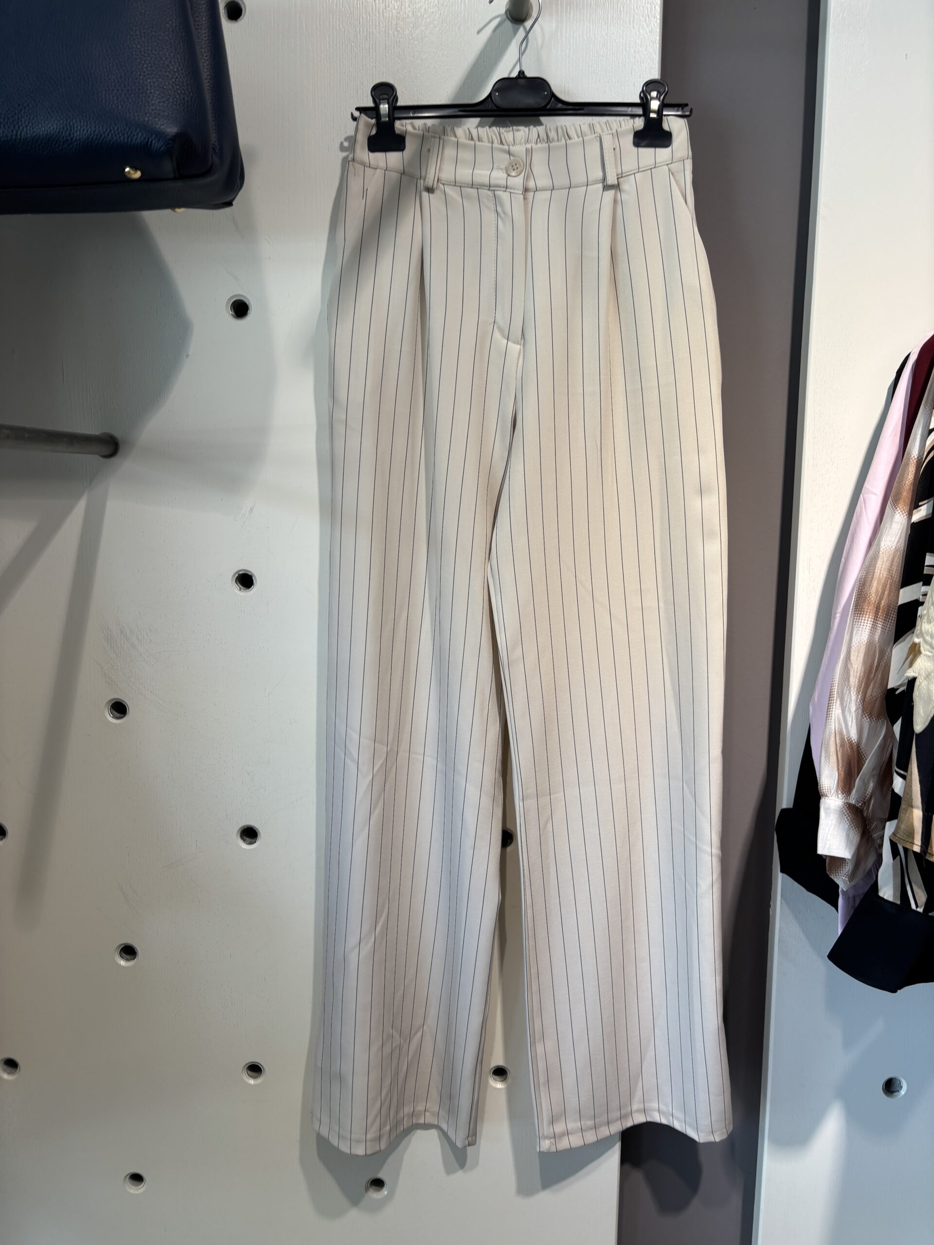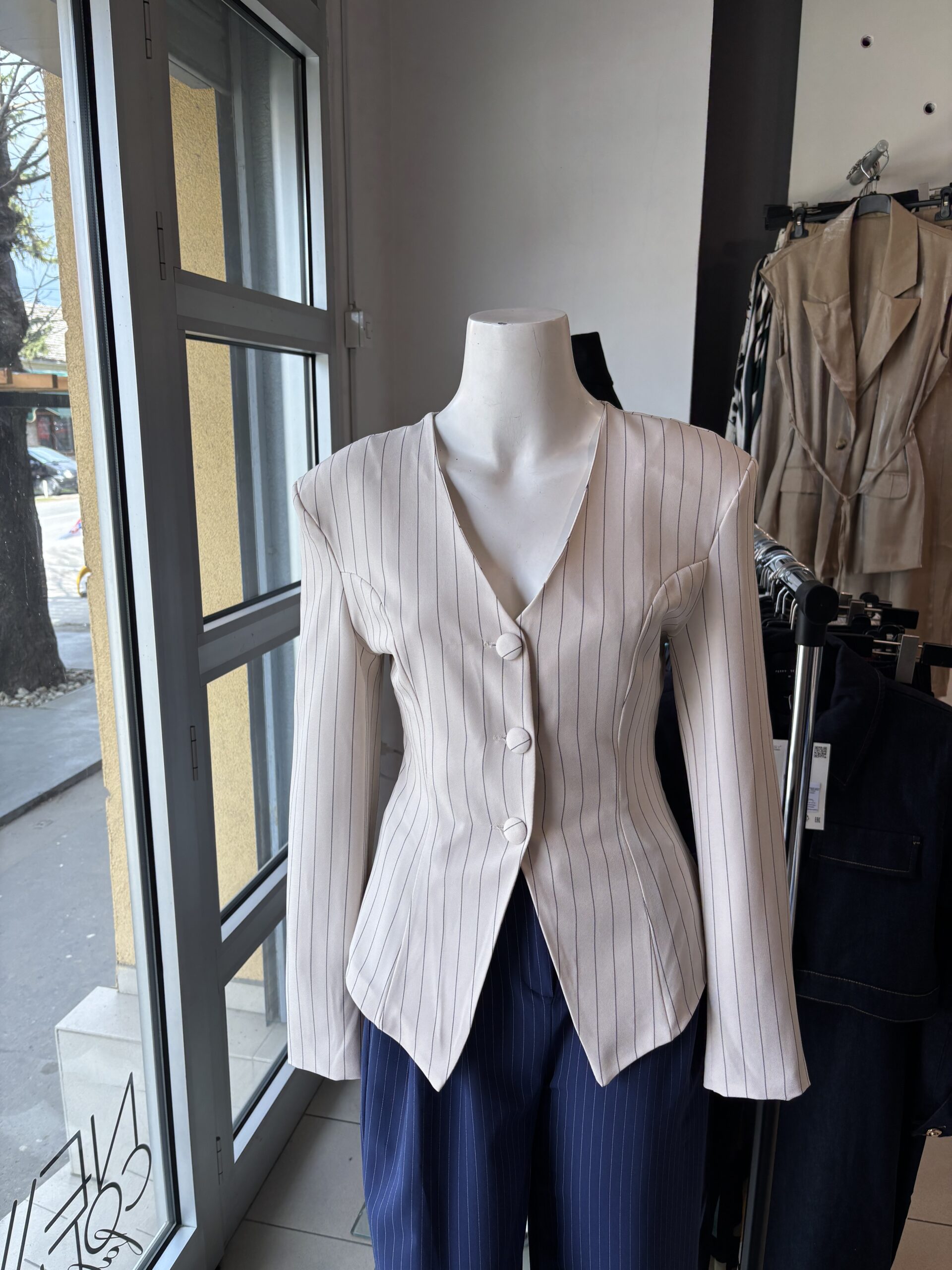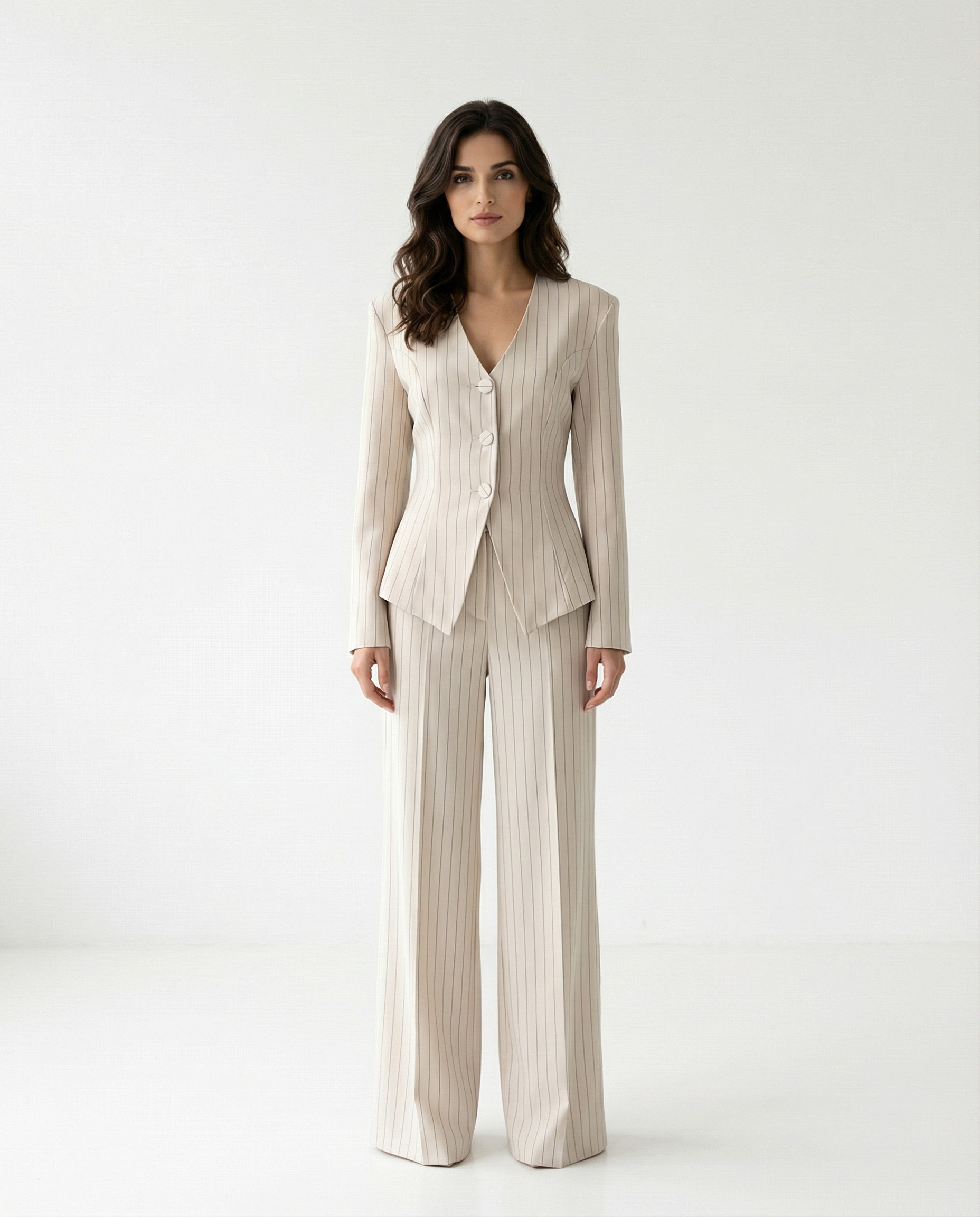 Moderan ženski komplet u svetloj bež nijansi sa suptilnim prugama koji pruža sofisticiran i poslovan izgled. Strukirani sako sa V izrezom naglašava figuru, dok pantalone širokog kroja vizuelno izdužuju siluetu i pružaju udobnost. Idealan izbor za poslovne prilike, ali i elegantne dnevne kombinacije.