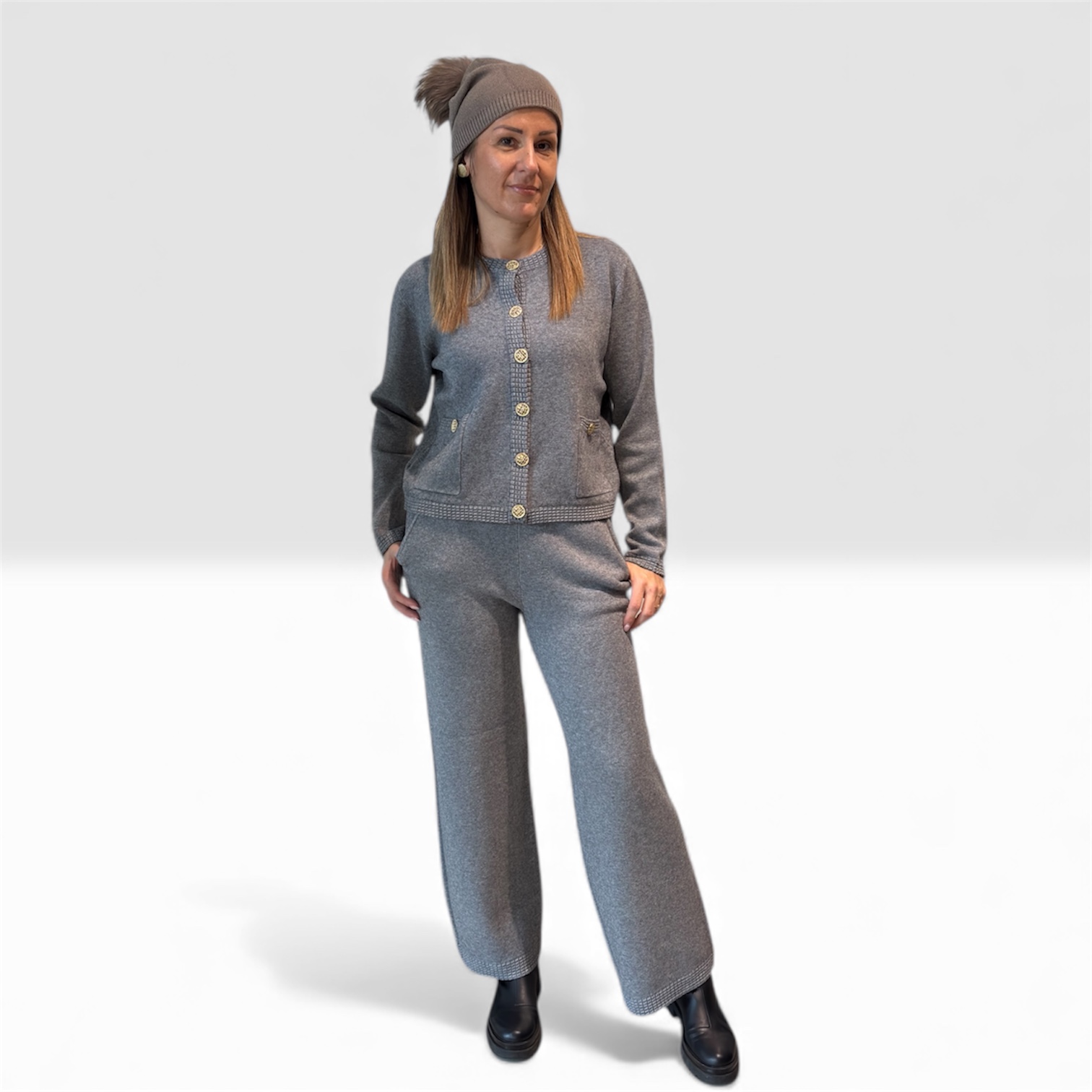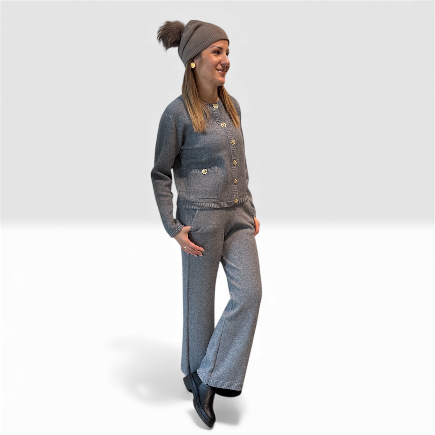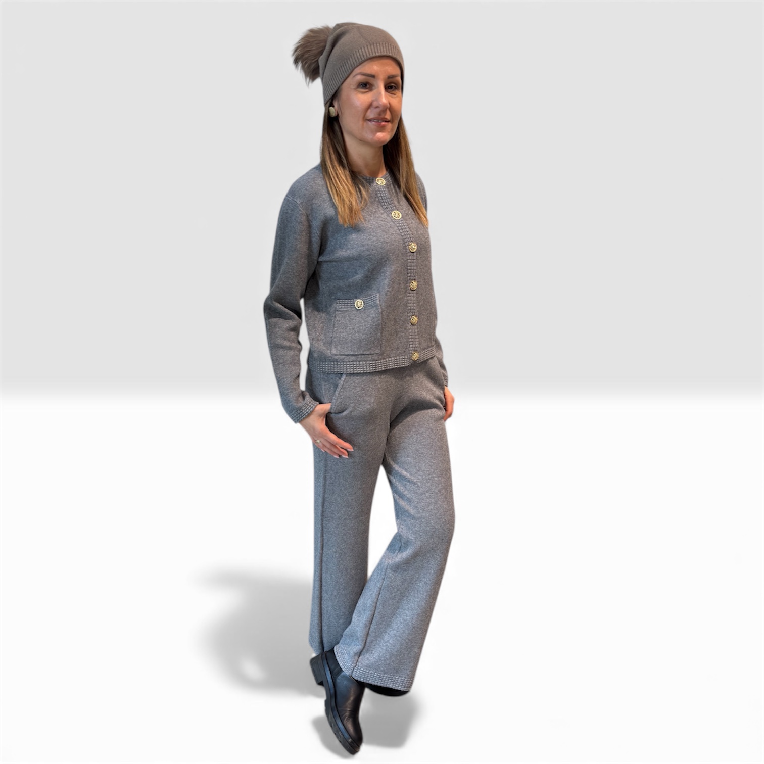Elegantan sivi komplet koji spaja udobnost i stil. Sastoji se od kardigana sa dekorativnim dugmadima i praktičnim džepovima, uz široke pantalone modernog kroja. Mekan i prijatan materijal čini ga idealnim izborom za svakodnevne kombinacije, ali i za opuštene, sofisticirane outfite.