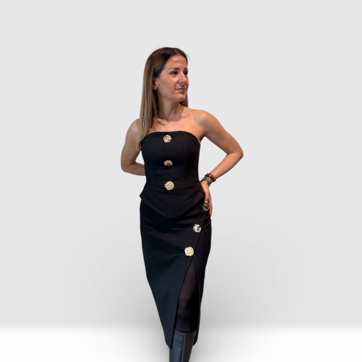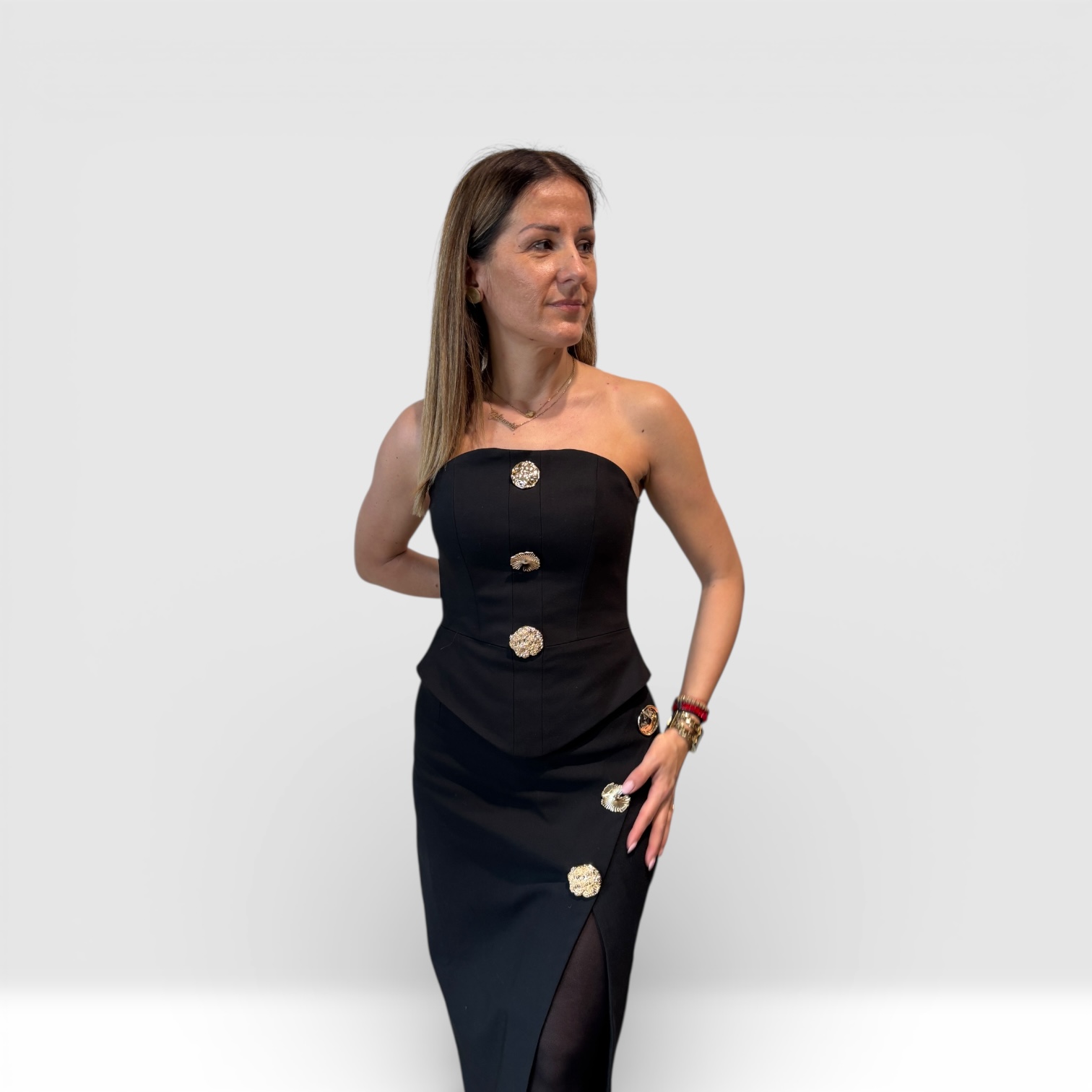 Elegantni ženski top bez bretela, izrađen od čvrstog i kvalitetnog materijala koji lepo oblikuje figuru. Minimalistički kroj ističe ramena i dekolte, dok dekorativni zlatni detalji na prednjem delu daju luksuzan i sofisticiran izgled. Idealan je za večernje i svečane kombinacije. Suknju sa slike možete pogledati na ovom linku.